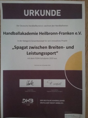 Die Handballakademie Heilbronn-Franken wurde für Ihre jehrelange Arbeit vom DHB ausgezeichnet.